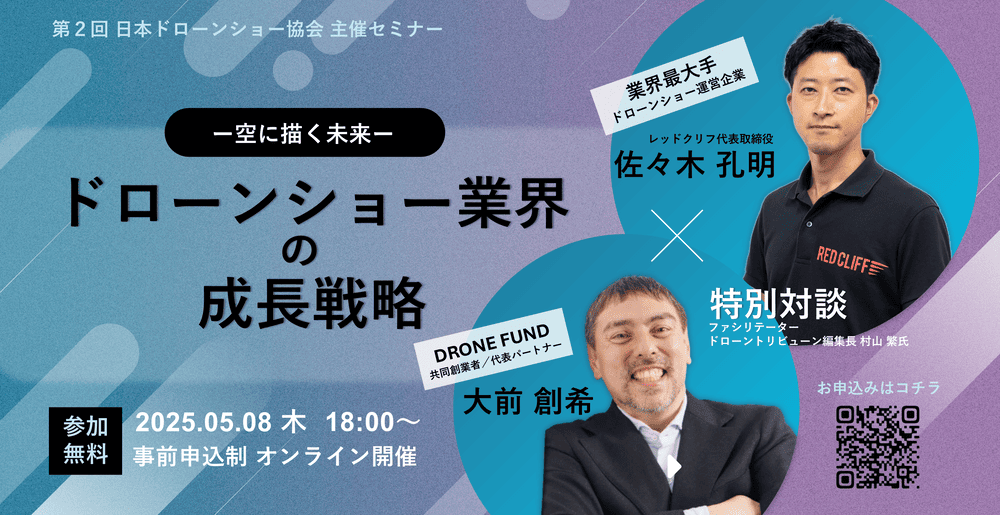 本ウェビナーでは、ドローン・エアモビリティ分野のベンチャー支援を行うDRONE FUND 共同創業者/代表パートナーであり、当協会理事も務める大前創希と、株式会社レッドクリフ 代表取締役であり、当協会の代表理事の佐々木孔明が登壇。業界の最前線で活躍する両名が、今後のドローンショーの可能性や成長戦略について語り合います。